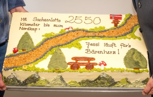 Am vergangenen Freitag erfolgte die symbolische Scheckübergabe im Kinderhospiz Bärenherz in Markleeberg. Für viel Freude sorgte dabei nicht nur die hohe Spendensumme, sondern auch der Scheck selbst: eine vom Ottendorfer Mühlenbecker filigran gefertigte XXL-Torte. Neben Jessika Klatt und Kerstin Waschke von Sachsenlotto war auch Schauspieler und Autor Hendrik Duryn mit vor Ort, der das Wanderprojekt engagiert supportet und auf seinen Social-Media-Kanälen begleitet hat.