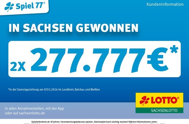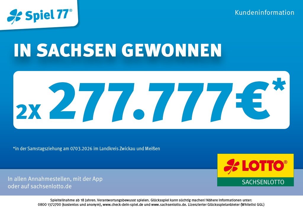 Gleich drei große Gewinne bringt die Ziehung am Samstag, 7. März 2026, nach Sachsen: 100.000 Euro bei SUPER 6 in Dresden sowie zweimal 277.777 Euro beim Spiel 77 im Landkreis Zwickau und im Landkreis Meißen.