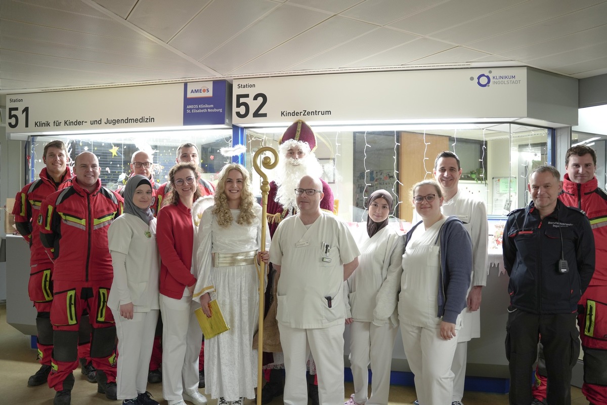 Mit weißem Bart, Zipfelmütze und rotem Gewand hat sich auch in diesem Jahr wieder ein als Nikolaus verkleideter Höhenretter der Berufsfeuerwehr Ingolstadt an der Außenfassade des Klinikums Ingolstadt abgeseilt und ist über ein Fenster direkt auf die Kinderstation geklettert. Dort wurde er von den kleinen Patientinnen und Patienten bereits mit großen Augen erwartet. Mit im Gepäck: ein Sack voller süßer Überraschungen.