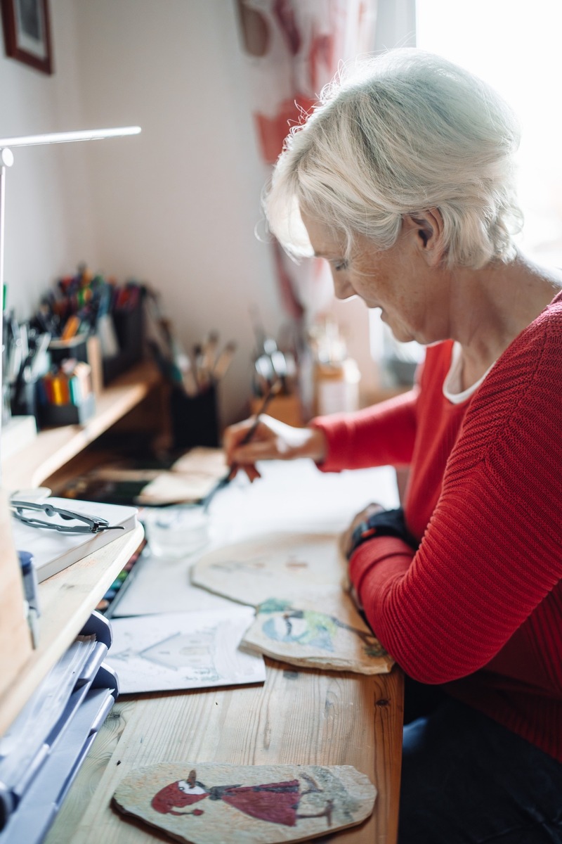 Dennoch bleibt sie aktiv. Besonders das Radfahren liebt sie. „Ich hasse es, überholt zu werden – deshalb habe ich jetzt ein E-Bike, ein richtiger SUV“, schwärmt sie lachend. Beim Radfahren spürt sie ihre Krankheit kaum: kein Zittern, keine Schmerzen, koordinierte Bewegungen. Auch das Malen gibt ihr Ruhe. In ihrem kleinen, selbst eingerichteten Atelier bemalt sie Jurasteinplatten mit Aquarellfarben. „Bei den feinen Pinselstrichen zittert nichts, auch nicht während der Off-Phase.“ Im nächsten Moment kann es jedoch sein, dass sie wie gelähmt ist und kaum aus dem Bett kommt.