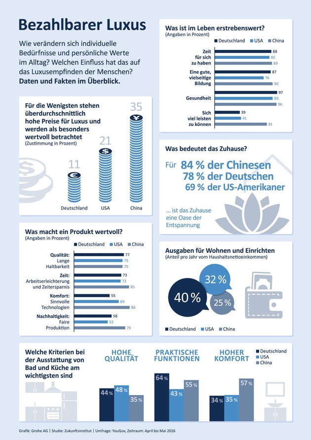 Das Zukunftsinstitut mit Firmensitz in Frankfurt am Main hat im Auftrag von GROHE die Studie zum Thema "Bezahlbarer Luxus" durchgeführt. An einer repräsentativen Online-Befragung des Marktforschungsinstituts YouGov nahmen von April bis Mai dieses Jahres 2.018 Deutsche, 2.170 US-Amerikaner und 1.050 Chinesen teil.