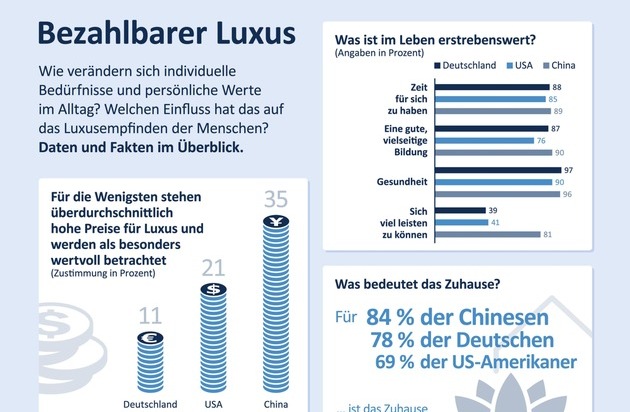 Wohnen wird in Bezug auf Luxus gleichgesetzt mit individueller Selbstentfaltung. Laut Statistischem Bundesamt investieren deutsche Haushalte 40 Prozent ihrer jährlichen Ausgaben in Wohnen und Einrichtung. In den USA sind es 32 Prozent, in China 25 Prozent. Weltweit schätzen die Menschen hohen Wohlfühlkomfort sowie maximale Lebensqualität und betrachten den Wohnraum als Oase zum Entspannen (Deutschland 78%, USA 69 %, China 84%).