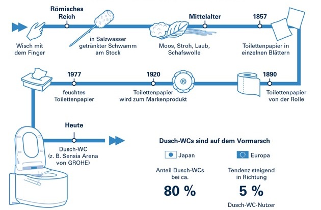 Die Römer nahmen die Finger zu Hilfe. Später tränkten sie kleine Schwämme in Salzwasser und befestigten sie an einem Stock. Im Mittelalter mussten Moos, Laub oder alte Lumpen herhalten. Wer wohlhabend war, konnte zu Schafswolle greifen. Keine Frage, das ursprüngliche "Toilettenpapier" ist weit von dem Hygieneartikel entfernt, den wir heute kennen und am 26. August mit dem "Internationalen Tag des Toilettenpapiers" würdigen. Doch die Hygienekultur ist nicht beim Papier stehen geblieben. Schon längst hat sie das nächste Level erreicht: "Waschen statt Wischen" lautet das neue Motto in der intimsten Körperpflege. Dieses neue Denken - ausgelöst wurde es durch die immer angesagteren Dusch-WCs - verändert die Welt.