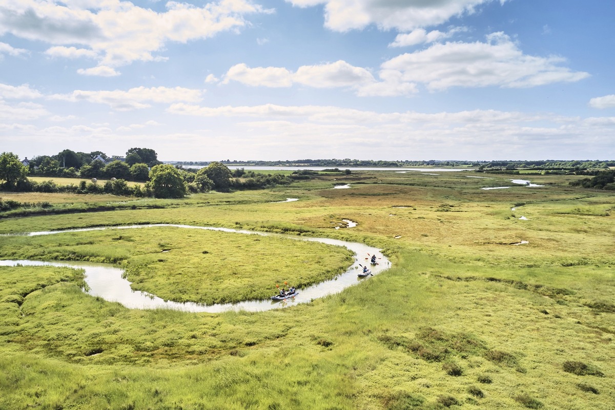 In Damgan im Süden der Bretagne kombiniert Brise et Voiles Radfahren und Kajakfahren. Über einen gut ausgebauten Radweg am Strand entlang geht es in nur 15 Minuten vom Ortszentrum zum Hafen von Pénerf im Regionalen Naturpark Golfe du Morbihan. Besonders praktisch: Ab hier übernimmt der Anbieter die gesamte Organisation. Die Fahrräder werden abgeholt und die Kajaks bereitgestellt. Anfängerinnen und Anfänger müssen sich gar keine Gedanken machen, denn bevor in See gestochen wird, gibt es eine ausführliche Einweisung zur Route und den Regeln für die Navigation. Im Kajak geht es dann mit der natürlichen Gezeitenströmung durch eine für die Region charakteristische Landschaft aus Schilf, Salzwiesen und ehemaligen Salinen – der Lebensraum zahlreicher Tierarten, die man vom Kajak aus beobachten kann. Nach fünf Kilometern auf dem Wasser geht es mit dem Fahrrad zurück nach Damgan. Kajaks gibt es für eine oder zwei Personen. Alle Informationen zur Tour finden sich unter briseetvoiles.com.