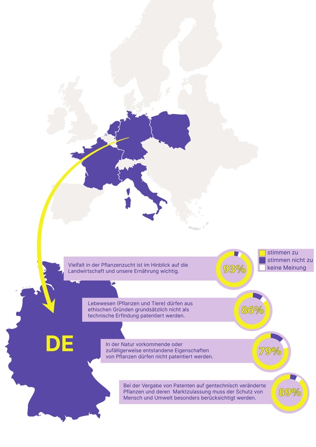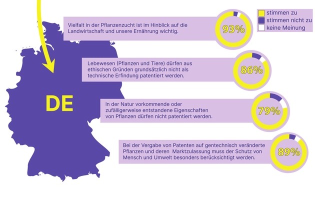 Die Umfrage zeigt die höchste Unterstützung (mehr als 90 Prozent) für die Feststellung, dass Vielfalt in der Pflanzenzüchtung und der Lebensmittelproduktion entscheidend ist und dass bei Patenten auf gentechnisch veränderte Pflanzen und deren Marktzulassung der Schutz der Umwelt einen hohen Stellenwert haben muss. Die höchsten Zustimmungen wurden hier in Polen und Italien verzeichnet, gefolgt von Deutschland und Frankreich.