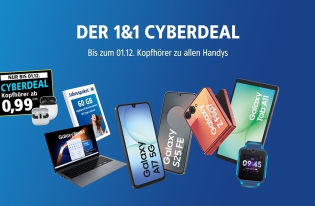 *Cyberdeal: Kopfhörer ab 0,99 €/Monat (Kopfhörer geräteabhängig) nur in Verbindung mit einem Vertrag über 24 Monate Mindestvertragslaufzeit mit Smartphone, Tablet oder Laptop, z.B. die Samsung Galaxy Buds3 FE für 0,99 €/Monat Aufpreis mit dem Samsung Galaxy A17 5G in Verbindung mit der 1&1 All-Net-Flat XS für 9,99 €/Mon und mit einer Einmalzahlung von 30,– €, zahlbar bei Vertragsende, spätestens nach 36 Vertragsmonaten. Oder z.B. Apple AirPods 4 für 2,99 €/Monat Aufpreis mit dem iPhone 17 in Verbindung mit der 1&1 All-Net-Flat S für 39,99 €/Mon. und mit einer Einmalzahlung von 300,– €, zahlbar bei Vertragsende, spätestens nach 36 Vertragsmonaten. Sofern der Vertrag nach 36 Monaten noch besteht, wird die Einmalzahlung im 36. Monat automatisch gutgeschrieben, sodass sie sich auf 0,– € reduziert. Die Aktion gilt für Smartphones aller Hersteller sowie ausschließlich für Laptops und Tablets der Hersteller Apple, Samsung und Lenovo. Die Aktion gilt für Smartphones aller Hersteller sowie ausschließlich für Laptops und Tablets der Hersteller Apple, Samsung und Lenovo.