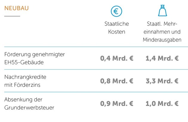 Beim Wohnungsbau können beispielsweise zinsvergünstige Nachrangkredite den Investoren das Bauen erleichtern, da die Kreditsumme nicht als Fremd-, sondern als Eigenkapital gewertet wird. Die Studie kommt auf rund zehn Milliarden Euro Investitionen bei 35.000 zusätzlichen Wohneinheiten pro Jahr. Auch den von der Ampel-Regierung gestrichenen Förderstandard "Effizienzhaus 55" kurzzeitig wiederzubeleben, kann einen Impuls bringen: "Wir gehen davon aus, dass kurzfristig mindestens 17.000 Wohnungen, die genehmigt, aber nicht gebaut wurden, mit der Förderung realisiert werden können", so Thamling weiter.