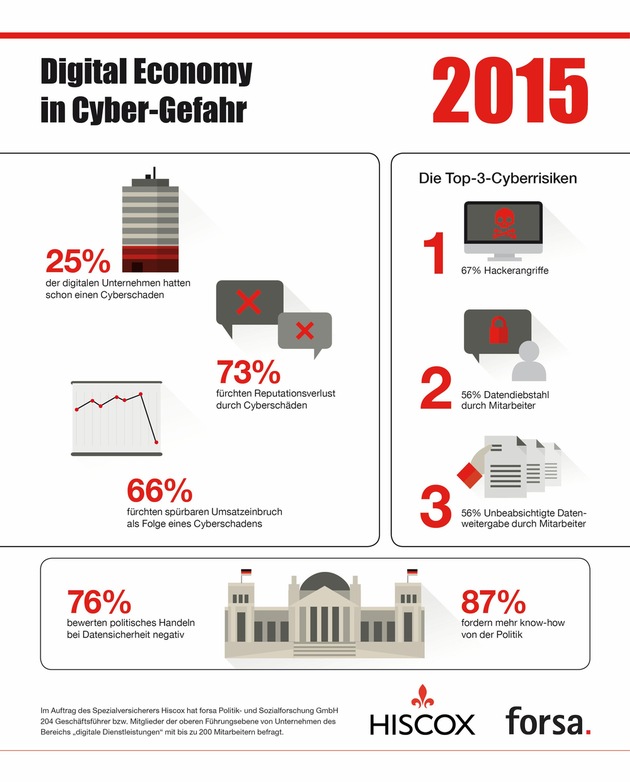 Die Digital Economy ist für die Sicherung des Standorts Deutschland im globalen Wettbewerb ein entscheidender Faktor. Als Innovationsindustrie ist sie in stärkerem Ausmaß als andere Branchen neuen Trends, Herausforderungen und Bedrohungen unterworfen. Vor diesem Hintergrund befragte forsa im Auftrag des Spezialversicherers Hiscox kleine und mittelständische Unternehmen der deutschen Digitalwirtschaft zu ihrem Umgang mit digitalen Cyber-Risiken. Die Studie zeigt: Trotz Wissens um die Bedrohung ist das Gefährdungspotential für die deutsche Digitalwirtschaft und damit den Wirtschaftsstanddort Deutschland erheblich.