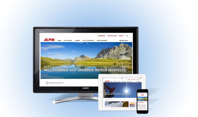 www.alpin.de wird jetzt auch dann optimal dargestellt, wenn von unterwegs auf das Angebot zugegriffen wird. Dank des innovativen Responsive Designs passt sich die Website automatisch jedem Format an - egal ob Desktop-PC, Tablet, oder Smartphone.