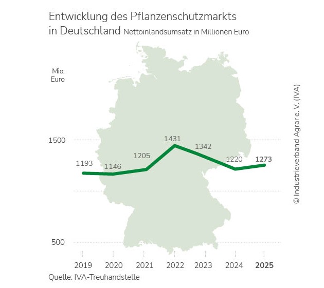 Der Nettoinlandsumsatz auf dem deutschen Pflanzenschutzmarkt (Direktgeschäft zwischen der im IVA organisierten Industrie und dem Pflanzenschutzgroßhandel) wuchs nach zwei Jahren deutlich rückläufiger Geschäfte um 4,3 Prozent auf 1,273 Milliarden Euro im Jahr 2025 (2024: 1,220 Mrd. Euro). Treiber für das Marktwachstum war ein gestiegener Herbizid-Umsatz mit 606 Millionen Euro (plus 18,6 Prozent), der mit vorgezogenen Käufen des Handels infolge unklarer Zulassungsfragen einzelner Wirkstoffe zusammenhing.