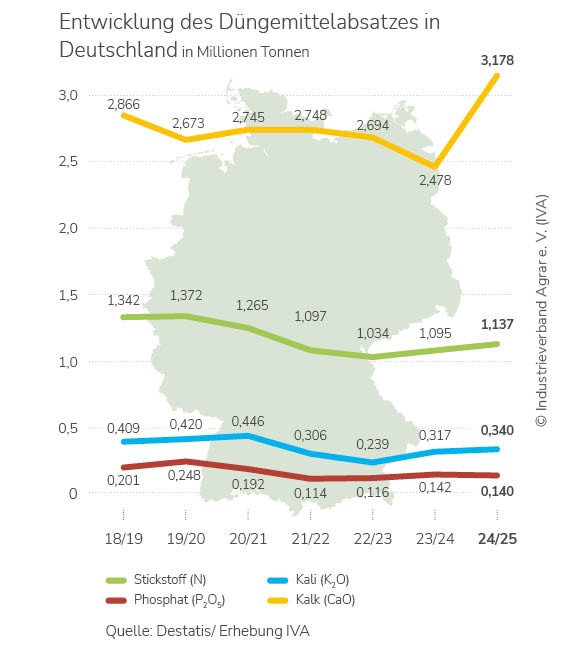 Während bei Phosphat-Düngern ein Minus von 1,7 Prozent (139 740 Tonnen P) zu verzeichnen war, konnten Kali-Düngemittel einen Absatzgewinn von 7,3 Prozent (340 350 Tonnen K) verzeichnen. Die Kalkdünger bewegen sich nach den Rückgängen aus den beiden Vorjahren kräftig nach oben (3,178 Millionen Tonnen CaO, ein Plus von 28,2 Prozent). Ursächlich sind die guten Witterungsbedingungen während der Hauptausbringzeit nach der Getreideernte.