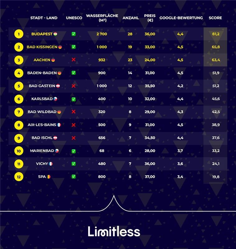 Der Index bewertet die zwölf wichtigsten öffentlichen Thermal-Städte Europas auf einer Skala von 0 bis 100 Punkten. Die Datenerhebung erfolgte im Januar 2026 über offizielle Betreiberangaben und Google Maps.