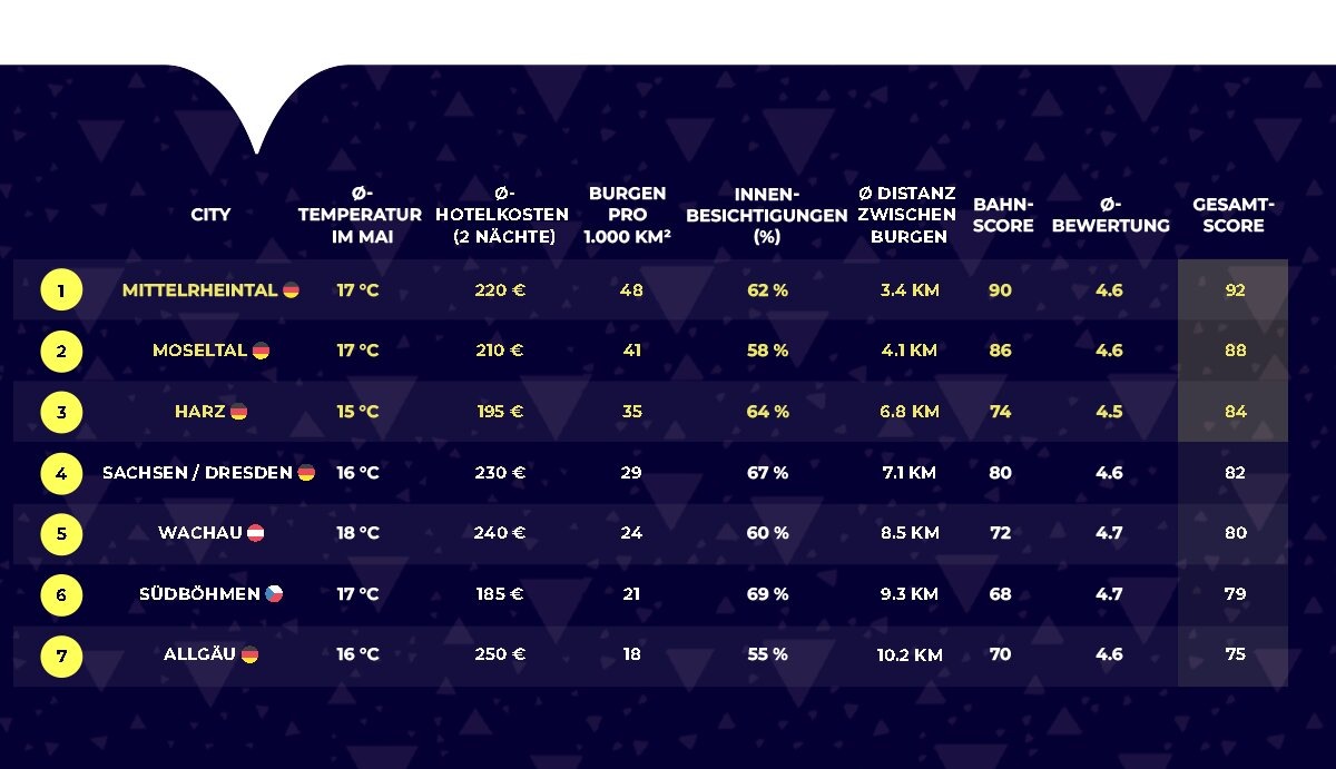 Angeführt wird das Ranking vom Mittelrheintal - vor allem dank seiner außergewöhnlich hohen Burgendichte. Laut Analyse kommen hier 48 Burgen pro 1.000 Quadratkilometer zusammen - der höchste Wert im gesamten Ranking. Hinzu kommt eine gute Erreichbarkeit: Rund 85 Prozent der Burgen sind in weniger als 20 Minuten mit öffentlichen Verkehrsmitteln erreichbar. Auch die Wege zwischen den Anlagen fallen kurz aus: Im Durchschnitt liegen nur etwa 3,4 Kilometer zwischen den Sehenswürdigkeiten. Die Region punktet auch mit ihrer Lage zwischen Weinbergen, historischen Orten und markanten Rheinlandschaften. Köln und Frankfurt liegen jeweils weniger als eine Stunde entfernt, das macht das Mittelrheintal besonders attraktiv für spontane Wochenendausflüge.