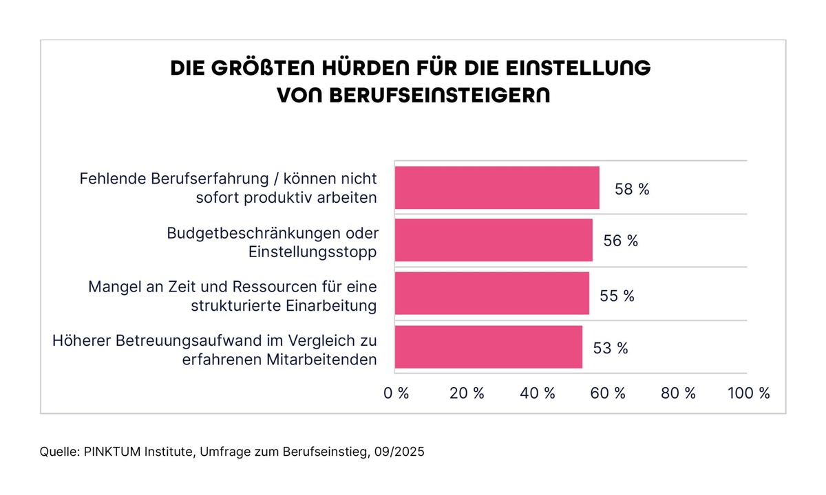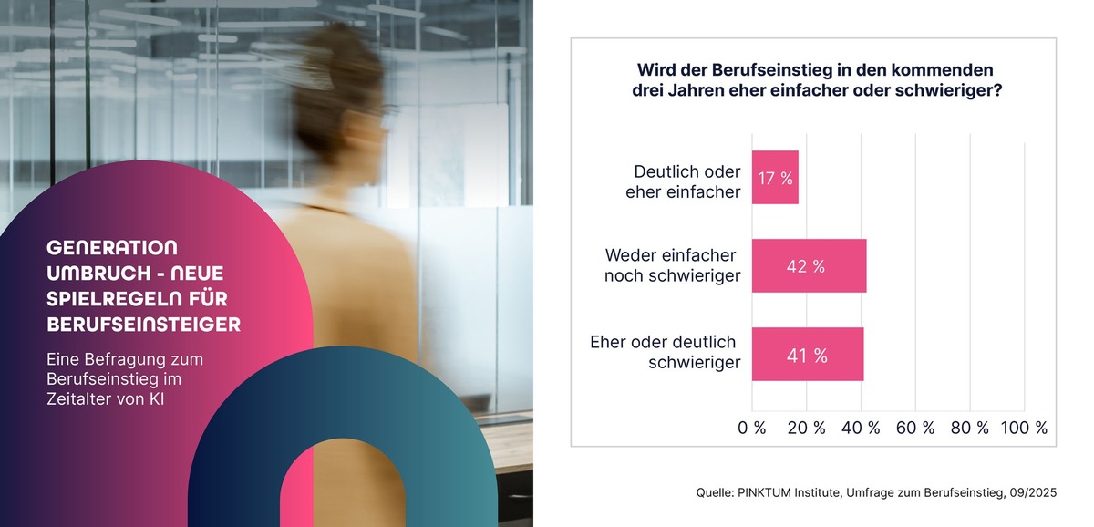 Der Berufseinstieg steht vor einer Wende. Lange Zeit waren Jobeinsteiger stark umworben. Doch jetzt stellt laut einer aktuellen Umfrage des PINKTUM Institute unter 105 HR-Verantwortlichen mehr als jedes vierte Unternehmen (28%) weniger Einsteiger ein als noch vor einem Jahr. Und das scheint erst der Anfang zu sein. 41 Prozent der Befragten glauben, dass der Berufseinstieg in den kommenden drei Jahren noch schwieriger wird. Nur 17 Prozent rechnen mit einer Entspannung.