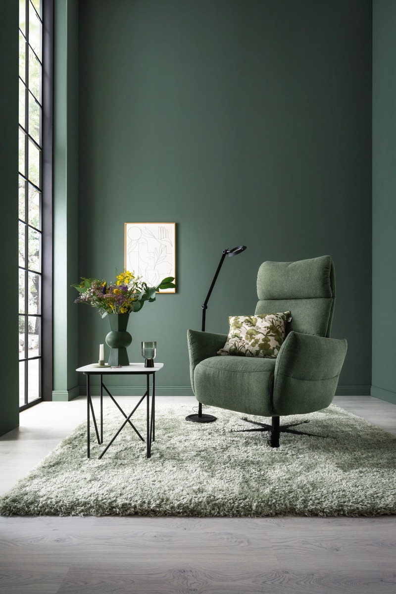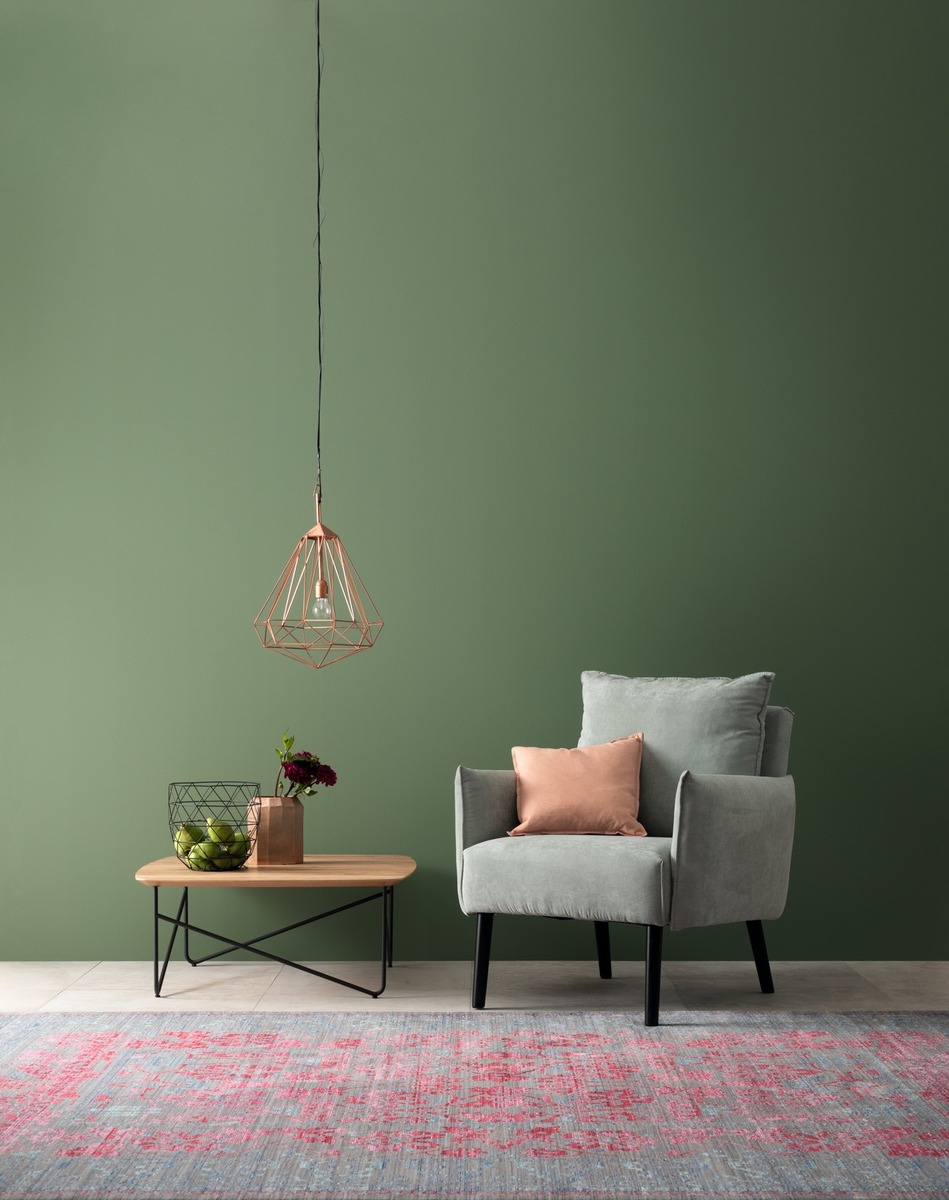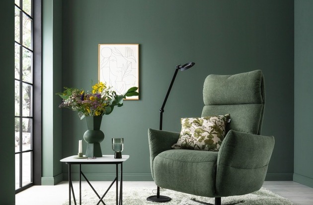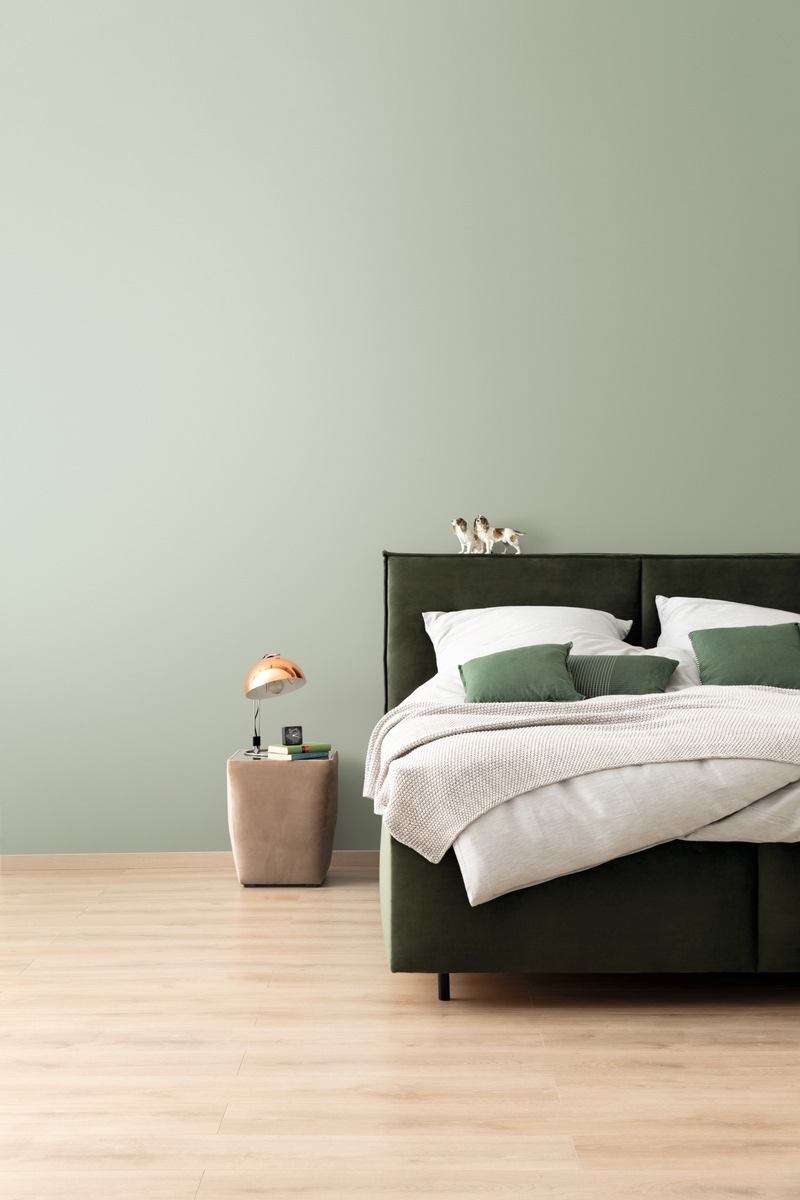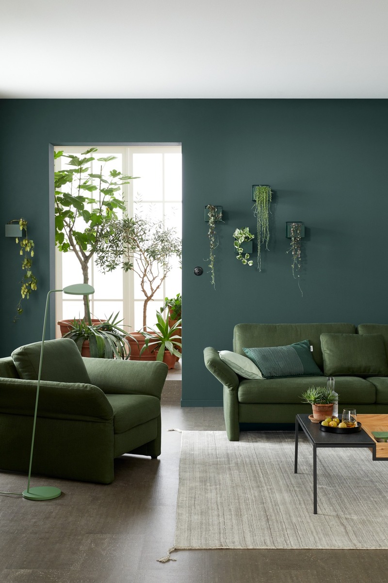 Tipp: Ein raffinierter Nebeneffekt entsteht gerade für kleinere Wohnungen: Grüne Sofas oder Sessel verschmelzen optisch mit der Wand und lassen den Raum großzügiger und ruhiger wirken. Wer es dezenter mag, setzt optische Highlights, etwa mit farbig lackierten Türen oder gezielt gesetzten Akzenten. Wandfarben wie die SCHÖNER WOHNEN Naturell Kreidefarbe „Waldgeflüster“ oder die SCHÖNER WOHNEN Designfarben „Erhabenes Agavengrün Nr. 27“ bzw. „Harmonisches Jadegrün Nr. 29“ schaffen eine stimmige Kulisse, die den Raum sanft umhüllt.