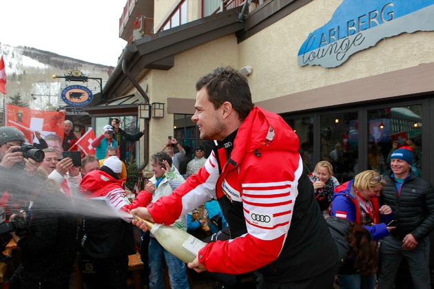 Die Terrasse der Arlberg Lounge füllt sich mit Schweizer Fahnenträgern und rot gekleideten Menschen mit weißen Kreuzen. Die Eidgenossen besetzen die Tische, kurze Zeit später erklingt der Klang der Kuhglocke, die die Ankunft des Bronzemedaillengewinners Beat Feuz einläutet. Nach der Übergabe der Schlumberger Sektflasche durch Erst-Gratulant Stefan Jochum und feucht fröhlicher Sektdusche, gibt Beat sein erstes Statement: "Schon in der Früh ist man herzlich willkommen in der Lech Lounge. Und jetzt so ein fantastischer Empfang um die Medaille zu feiern, da ist es umso schöner wieder herzukommen!"