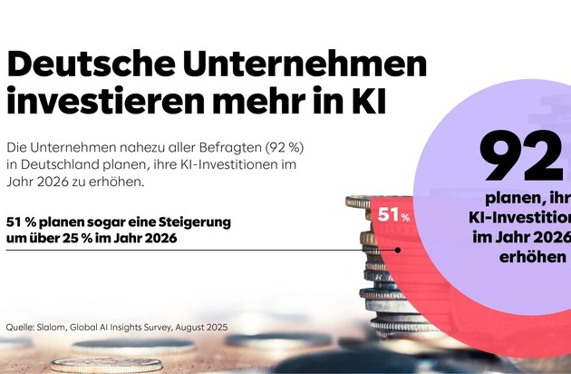 Deutsche Unternehmen investieren deutlich mehr in KI, wie eine aktuelle Studie des Technologieberatungsunternehmens Slalom unter 2000 Befragten weltweit und 161 Befragten in Deutschland zeigt. Demnach planen 92 Prozent der befragten Führungskräfte, ihre KI-Investitionen 2026 gegenüber 2025 zu erhöhen. Die Mehrheit (51 Prozent) plant Mehrausgaben von mehr als 25 Prozent. 46 Prozent wollen ausgewogen investieren, 20 Prozent ROI-getrieben und 16 Prozent aggressiv. Weitere 16 Prozent möchten investieren, um zu testen und zu lernen. "Der Investitionswille in KI-Technologien ist ein äußerst positives Signal. Doch Technologie und Mitarbeiterbefähigung sollten auf eine gut abgestimmte Strategie folgen, nicht umgekehrt. KI-Projekte sind nur dann erfolgreich, wenn sie mit konkreten Geschäftswerten und Mitarbeiterbefähigung umgesetzt werden. So entstehen nachhaltige Ergebnisse statt teurer Experimente", erklärt Denis Gassmann, Geschäftsführer von Slalom Germany.