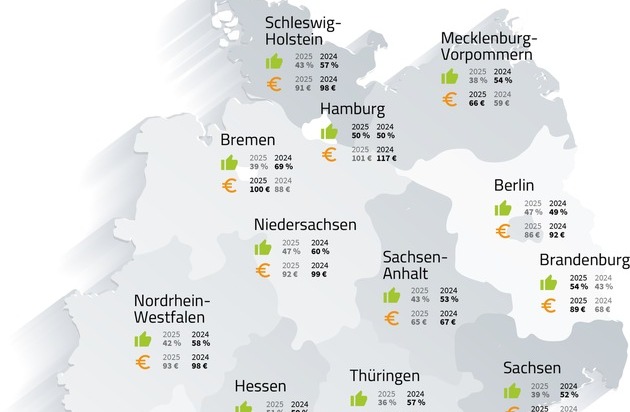 Nur in Brandenburg scheint sich die Lage gebessert zu haben: Dort bewerteten rund 46 Prozent der Befragten die wirtschaftliche Lage ihres Unternehmens als gut. Das ist eine leichte Verbesserung im Vergleich zur letzten Umfrage in 2024. Seinerzeit lag der Anteil derer, die die wirtschaftliche Lage ihres Unternehmens als gut bis hervorragend eingeschätzt haben, in Brandenburg bei 43 Prozent.