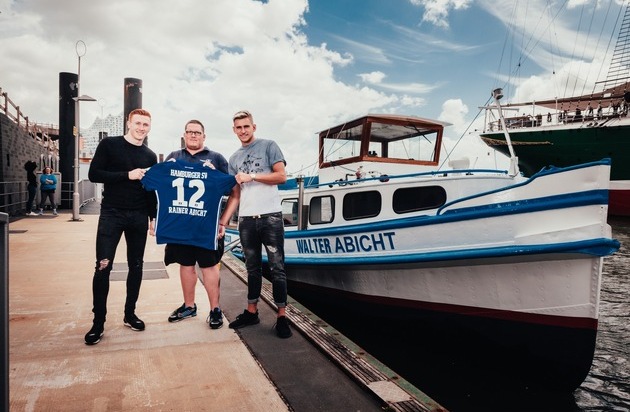 Die beiden HSV-Profis Julian Pollersbeck und David Bates läuteten die Partnerschaft bereits durch eine Trikotübergabe im Hafen an einen Kapitän von Rainer Abicht ein.
