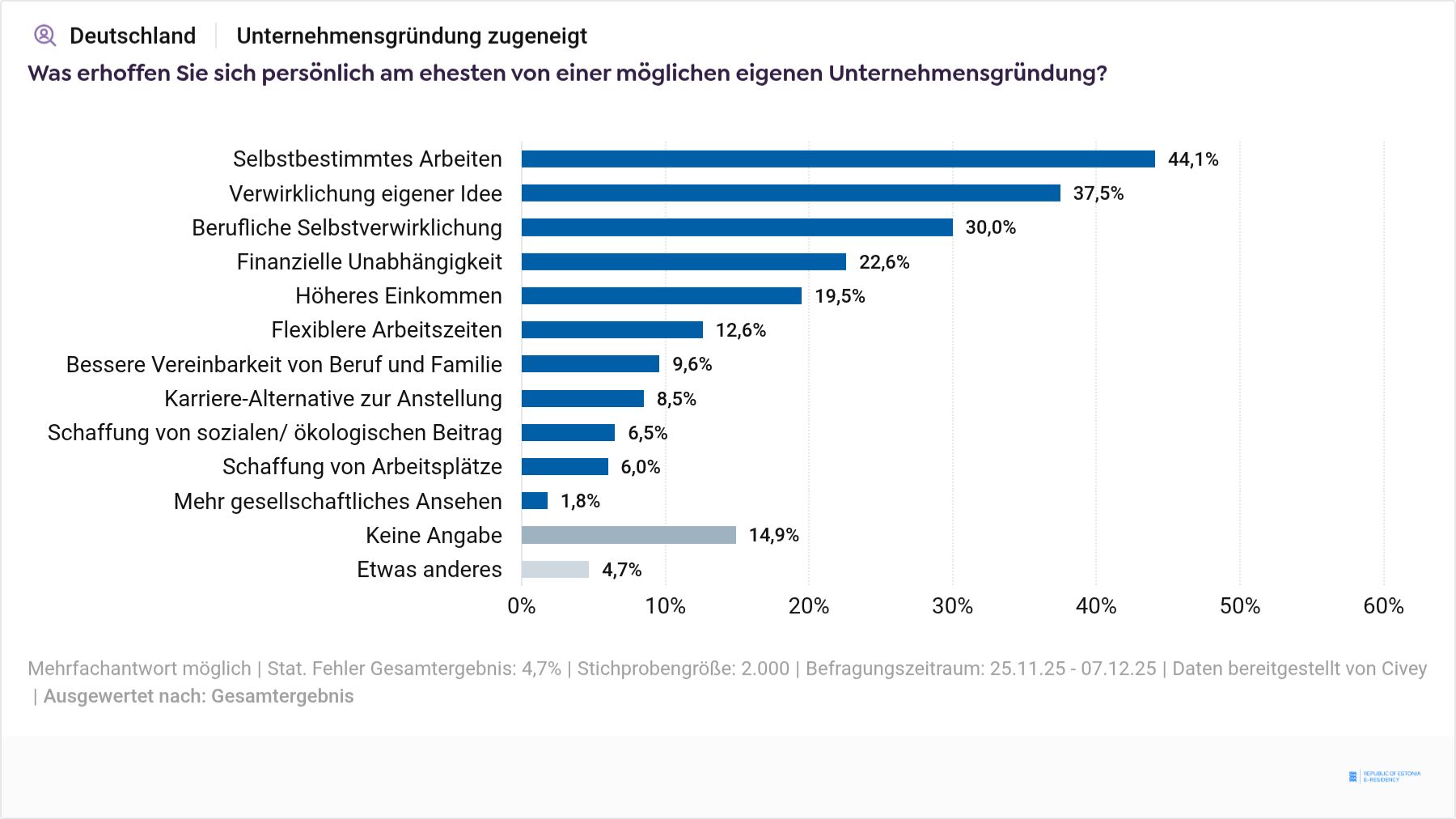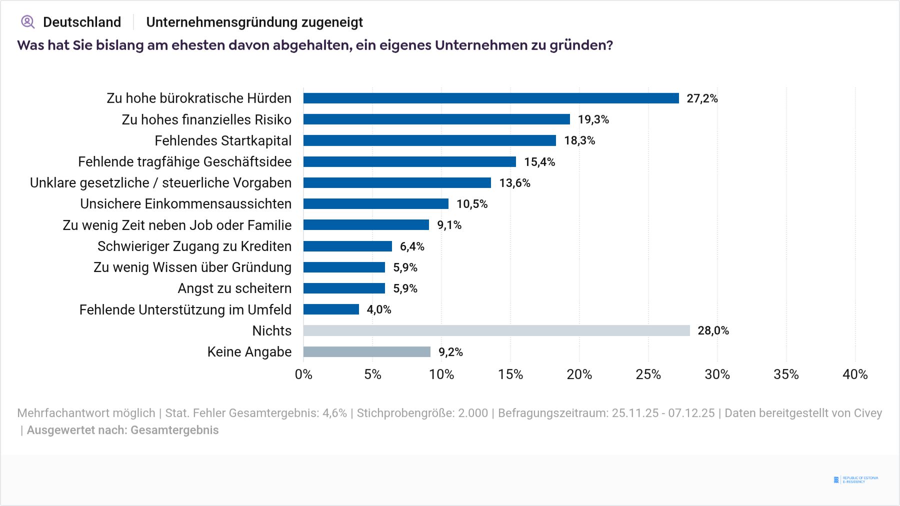 Civey hat für e-Residency of Estonia vom 25.11. bis 07.12.2025 online 2.000 gründungsinteressierte Personen befragt. Die Ergebnisse sind repräsentativ unter Berücksichtigung des statistischen Fehlers von 4,7 Prozentpunkten beim jeweiligen Gesamtergebnis.