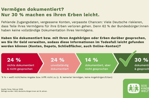 Zur Studie: Im Auftrag der SOS-Kinderdörfer weltweit hat das Sozialforschungsinstitut forsa im Februar 2026 eine bundesweite Befragung zum Thema Vermögen und gemeinnütziges Vererben durchgeführt. Im Rahmen eines repräsentativen Panels wurden insgesamt 1.622 zufällig ausgewählte deutschsprachige Personen ab 18 Jahren befragt.