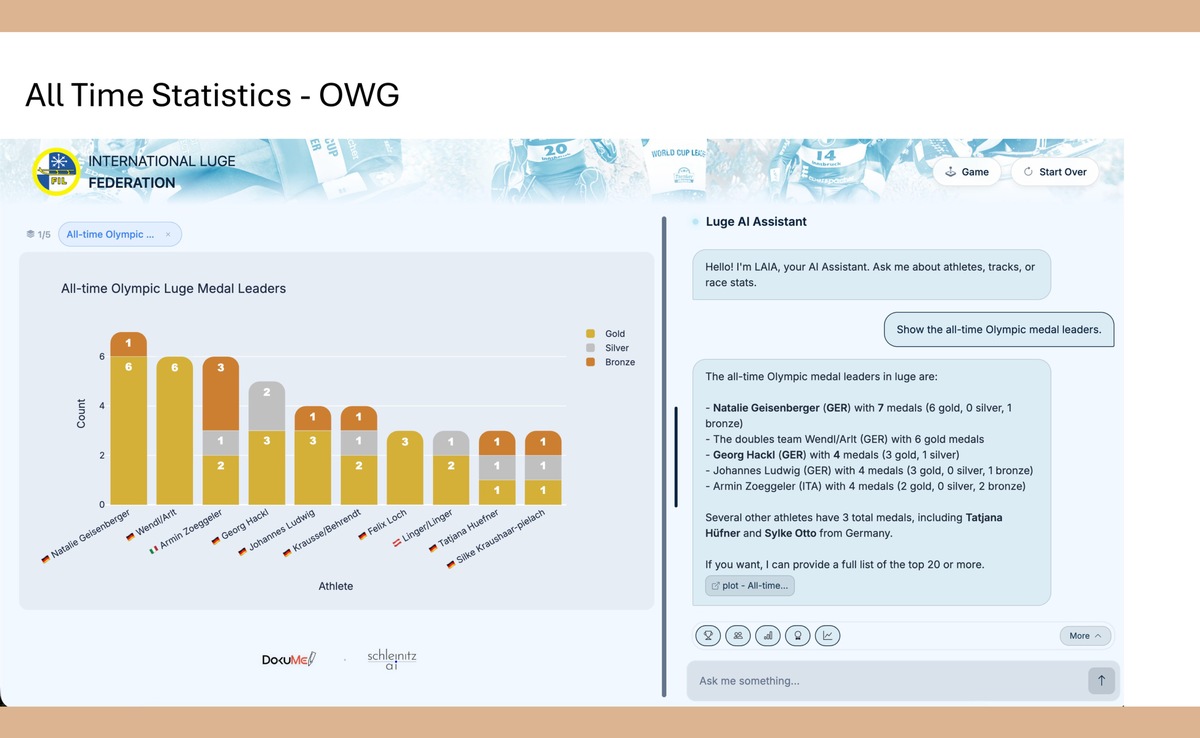 Der FIL KI Assistant kombiniert umfassendes Expertenwissen mit datengestützten Analysen. Das Herzstück von LAIA ist ein speziell für dieses Projekt erstellter Datensatz zum Rodeln: eine Datenbank mit mehr als 42.000 Rennergebnissen, deren Aufzeichnungen für bestimmte Rennformate bis ins Jahr 1950 zurückreichen. Diese Datentiefe ermöglicht es, historische Trends, Athletenkarrieren und Streckenvergleiche mit einer bisher nicht erreichten Detailgenauigkeit zu verfolgen.