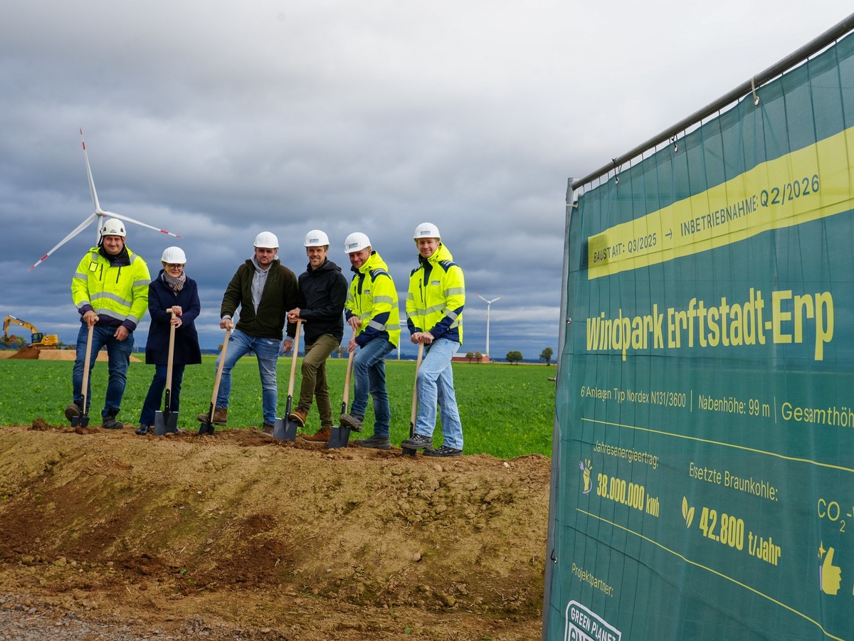 Hamburg/Erftstadt, 21. Oktober 2025 – Mit einem symbolischen Spatenstich haben die Ökoenergiegenossenschaft Green Planet Energy und die österreichische oekostrom AG heute den Bau des neuen Windparks Erftstadt in Nordrhein-Westfalen eingeläutet. Künftig sollen im Ortsteil Erp, rund 25 Kilometer südwestlich von Köln, sechs Windenergieanlagen vom Typ Nordex N131/3600 mit einer Gesamthöhe von 164,5 Metern und einer Leistung von insgesamt 21,6 Megawatt rund 38 Millionen Kilowattstunden grünen Strom pro Jahr erzeugen – genug, um über 11.000 Haushalte klimafreundlich zu versorgen. Der Windpark ist ein Gemeinschaftsprojekt der beiden Energiepioniere: Rund 60 Prozent der Anteile liegen bei Green Planet Energy eG, rund 40 Prozent bei der oekostrom AG.
