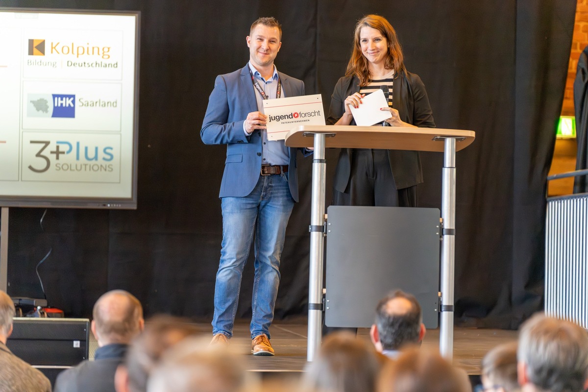 3 Plus Solutions ist ab sofort offiziell Patenunternehmen von Jugend forscht Saarland. Im Rahmen der Feierstunde des Jugend forscht Landeswettbewerbs 2026 wurde dem Unternehmen am 18. März 2026 im Lokschuppen Dillingen die offizielle Begrüßungsplakette überreicht. Übergeben wurde sie von Anna Helbling aus der Geschäftsstelle der Stiftung Jugend forscht e. V. in Hamburg.