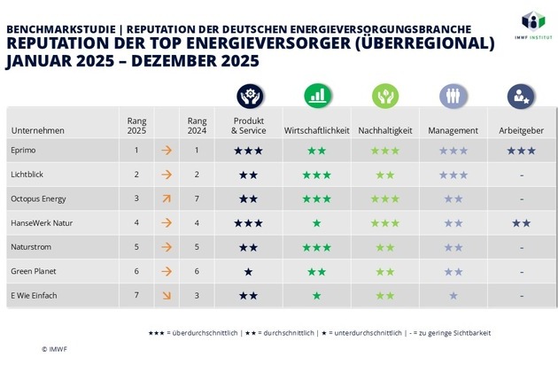 Bei Energieversorgern entscheidet nicht nur, was sie leisten. Genauso wichtig ist, wie Kundinnen und Kunden darüber sprechen. Das aktuelle Reputationsranking der Energieversorgungsbranche zeigt eine deutliche Verschiebung bei den mittelgroßen überregionalen Anbietern: Octopus Energy rückt um vier Plätze auf Rang 3 vor. Die beiden Spitzenplätze belegen wie im Vorjahr Eprimo und Lichtblick. Für die Analyse wertete das IMWF Institut über 179.000 reputationsrelevante Online-Erwähnungen aus redaktionellen Medien, Presseportalen, sozialen Netzwerken, Foren, Blogs und Bewertungsplattformen im Zeitraum vom 1. Januar bis 31. Dezember 2025 aus.
