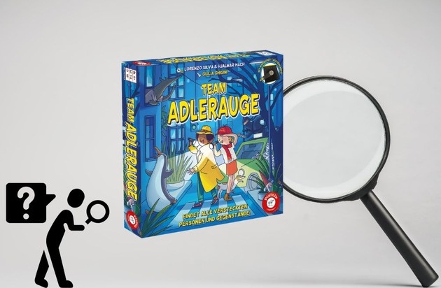 Das kooperative Spiel um versteckte Personen und Gegenstände, geeignet für Kinder ab sechs Jahren, stammt von den Autoren Lorenzo Silva und Hjalmar Hach. „Team Adlerauge“ lässt sich allein oder mit bis zu fünf Personen spielen. Der magische Effekt der Taschenlampen kommt am besten beim Spielen in einem nicht zu hellen Raum oder am Abend zur Geltung. Nach fünf Runden, die zusammen etwa fünfzehn Minuten dauern, steht fest, ob es alle rechtzeitig zur Schlafenszeit nach Hause geschafft haben. Wer noch nicht müde ist, kann mit „Team Adlerauge“ gleich danach eine neue Entdeckertour wagen.