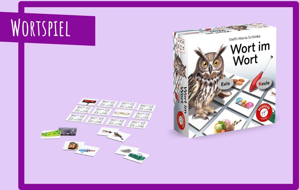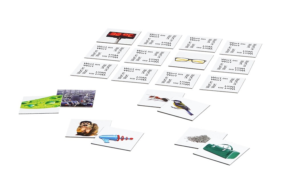 Nach den ebenso beliebten und erfolgreichen Varianten „Old & New“ und „Eindeutig Zweideutig“ erweitert der Wiener Spieleverlag Piatnik nun mit „Wort im Wort“ die Serie außergewöhnlicher Memos. Genau wie seine Vorgänger hat es auch diese herausfordernde Version ganz schön in sich. Es geht nämlich nicht darum, zwei völlig gleiche Bildplättchen zu finden, sondern jene mit – wie der Name schon verrät – dem Wort im Wort. Ein Paar gehört also nur dann zusammen, wenn der Begriff des einen komplett im zweiten vorkommt, wie beispielsweise „Ass“ in „Fass“.