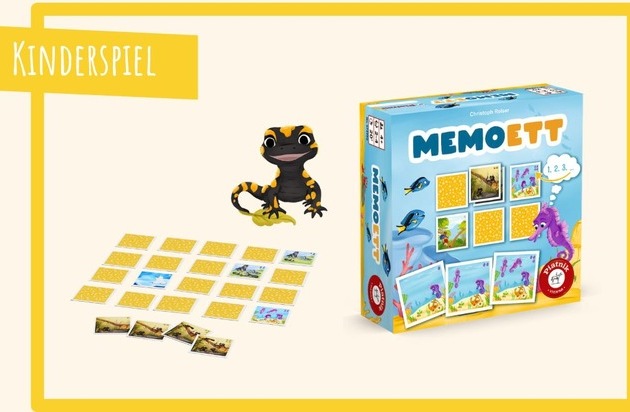 Mit „Memoett“ präsentiert der Wiener Spieleverlag Piatnik ein besonderes Memospiel für kleine Entdecker ab vier Jahren. Denn anstatt eines Pärchens gilt es hier gleich eine ganze Tierfamilie zu finden und das auch noch in der richtigen Reihenfolge. Zwei Varianten sorgen für lange anhaltenden Spielspaß.