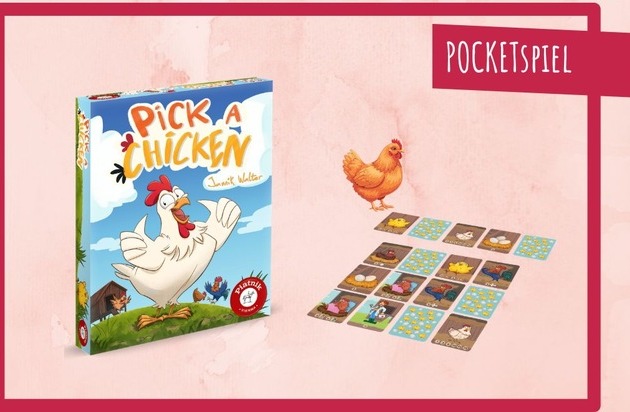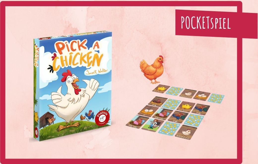 In „Pick a Chicken“, dem neuen Kartenablegespiel des Wiener Spieleverlags Piatnik für Kinder ab sechs Jahren, geht es wahrlich tierisch zu. Damit alle Bewohner des Hühnerstalls zufrieden sind und am Ende möglichst viele Punkte einbringen, gilt es, deren Vorlieben und Bedürfnisse zu beachten: Der Hahn mag natürlich allein regieren, die Küken fühlen sich immer zu zweit am wohlsten, kranke Hühner brauchen eine Tierärztin neben sich und so weiter. Wer den eigenen Hühnerstall durch geschickten Kartentausch bestmöglich optimiert, hat gute Chancen auf den Sieg. Verschiedene Möglichkeiten zu punkten und die witzigen Illustrationen machen das flotte Pocketspiel besonders reizvoll.