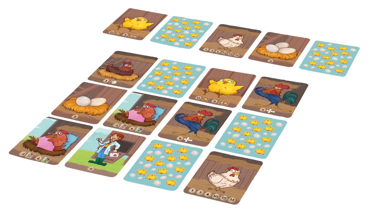Unter den 55 Spielkarten befinden sich gesunde und kranke Hennen, Glucken, Küken, Eier, Hähne und die Tierärztin. Anfangs legt jede Person 12 davon verdeckt in einem 3x4-Raster aus, das ist der persönliche Hühnerstall. Wer zuletzt ein Huhn gesehen hat, beginnt mit der Optimierung des eigenen Hühnerstalls. Dazu wird eine von fünf offen in der Tischmitte ausliegenden Karten gegen eine weiterhin verdeckt bleibende aus dem eigenen Hühnerstall getauscht. So wird reihum die Anzahl der offen ausliegenden Karten in der Tischmitte immer kleiner und somit auch die Auswahl. Erst wenn dort nur noch verdeckte Karten vorhanden sind, wenn man an der Reihe ist, dürfen alle fünf Karten aufgedeckt werden und bilden eine neue Tausch-Auslage. Für das Ablegen im Hühnerstall gilt: Was liegt, das pickt. Hahn, Henne, Küken und Co. dürfen also im Nachhinein nicht mehr bewegt werden. Sind alle 12 Plätze im Hühnerstall vergeben, folgt die Wertung.