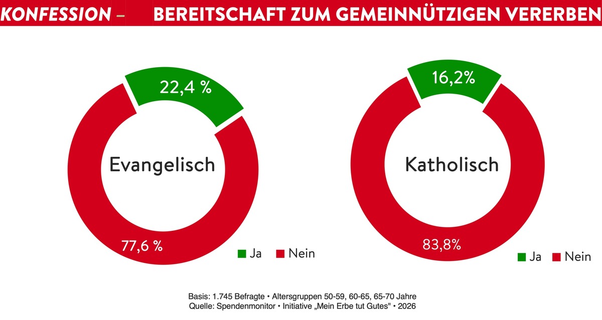 Schleswig-Holstein liegt im Vergleich der Bundesländer zwar im Durchschnitt, schlägt aber Hamburg deutlich in der Bereitschaft gemeinnützig zu vererben. Spitzenreiter unter den Bundesländern in der Bereitschaft zum Erbe für den guten Zweck ist Bremen mit 33,4 Prozent, dicht gefolgt vom Flächenland Niedersachsen mit 26,7 Prozent. Ein weiterer bemerkenswerter Trend: Die historische Kluft zwischen alten und neuen Bundesländern schließt sich schneller als erwartet. Der Unterschied bei der Bereitschaft, gemeinnützig zu vererben, beträgt nur noch 2,7 Prozentpunkte. In Ballungsräumen ist die Offenheit insgesamt dennoch am größten – ein Hinweis darauf, dass urbane Lebensstile und zivilgesellschaftliches Engagement sich gegenseitig begünstigen. Interessant ist auch, dass die Bereitschaft bei evangelisch geprägten Menschen mit 22,4, Prozent um 7,7 Prozentpunkte höher liegt als bei Katholiken mit 17 Prozent.