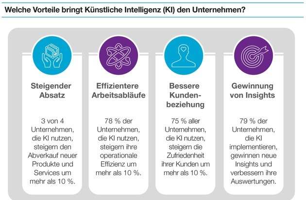 Technikaffine Unternehmen nutzen KI aus folgenden Gründen: Sie steigern ihren Absatz und ihre operative Leistungsfähigkeit, vereinfachen die Interaktion mit Kunden und gewinnen Insights in ihr Geschäft. Dass dies funktioniert, belegt die Tatsache, dass drei Viertel aller Unternehmen ihre Verkaufszahlen bereits um zehn Prozent erhöhen konnten, seitdem sie auf KI setzen. Das Kundenerlebnis ist ein Schwerpunkt der KI-Anwender: 73 Prozent gehen davon aus, dass KI die Kundenzufriedenheit steigern kann und 65 Prozent glauben, dass sie die künftige Abwanderung von Kunden reduzieren kann.