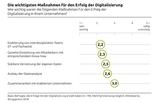 Die Digitalisierung hat weiterhin sehr hohe Bedeutung für Unternehmen: Mehr als ein Drittel der CIOs im deutschsprachigen Raum bezeichnen sie in ihrem Unternehmen als erfolgreich und weitere 5,2 Prozent sogar als sehr erfolgreich (Summe = 39,7 Prozent). Am meisten haben sie ihrer Einschätzung nach bei der Erhöhung der Effizienz im Tagesgeschäft und der Sicherung der Marktposition des Unternehmens erreicht. Schwer hingegen tun sie sich weiterhin beim Erschließen neuer Geschäftsfelder. Außerdem berichten jetzt deutlich weniger CIOs von Problemen bei der Digitalisierung. Die Quote sank gegenüber der Vorjahresstudie von 72,7 Prozent auf 62,9 Prozent. Die größte Hürde ist nach wie vor der Mitarbeitermangel, gefolgt von unflexiblen Geschäftsprozessen und der begrenzten Anpassungsfähigkeit der Altsysteme. Erhoben wurden diese Angaben im Rahmen der jährlichen IT-Trends-Studie im Herbst 2017. Insgesamt nahmen 121 IT-Verantwortliche von Unternehmen in Deutschland, Österreich und der Schweiz teil. Die Capgemini-Studie erscheint im sechzehnten Jahr.