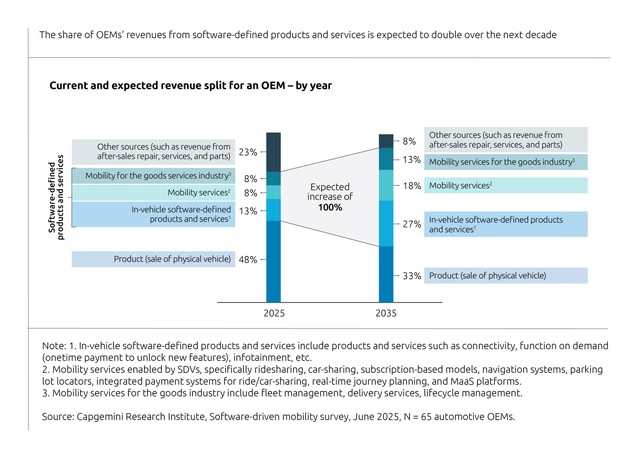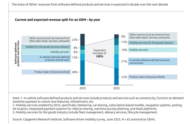 Die Automobilbranche befindet sich in einem tiefgreifenden Umbruch. Softwarebasierte Fahrzeugfunktionen sowie Mobilitätsdienstleistungen werden im Jahr 2035 mehr als die Hälfte des Gesamtumsatzes von OEMs (Original Equipment Manufacturer) ausmachen - damit verdoppelt sich der Anteil im Vergleich zu heute. Während die Hersteller heute noch knapp die Hälfte ihres Umsatzes mit dem Verkauf von Fahrzeugen erwirtschaften, wird dieser Anteil bis 2035 auf ein Drittel sinken. Das zeigt die aktuelle Studie des Capgemini Research Institute, "The software-driven mobility era: Beyond vehicles". Über 80 Prozent der Befragten gehen davon aus, dass softwarebasierte Funktionen und Dienstleistungen künftig den Großteil der Wertschöpfung ausmachen, nicht mehr das Fahrzeug selbst.