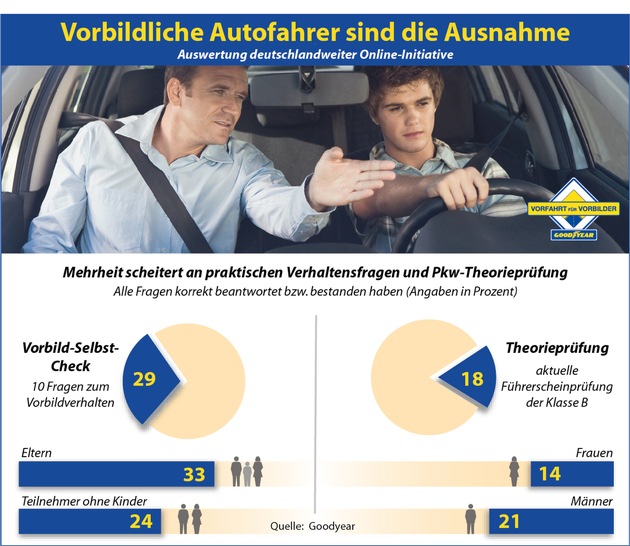 Vorbildliche Pkw-Fahrer sind im Autoland Deutschland die Ausnahme. Dies ist das Ergebnis eines von Goodyear gemeinsam mit Verkehrspsychologen und Fahrlehrern speziell entwickelten Online-Tests zum praktischen Vorbild-Verhalten auf der Straße. Weniger als ein Drittel (29 Prozent) der insgesamt rund 1.000 Teilnehmer des "Vorbild-Selbst-Checks" kann alle zehn Fragen auf Anhieb richtig beantworten. Eltern schneiden zwar mit überdurchschnittlichen 33 Prozent deutlich besser ab als Personen ohne Kinder (24 Prozent), jedoch ebenfalls auf niedrigem Niveau. Auch eine aktuelle Theorieprüfung der Führerscheinklasse B bestehen nur rund 18 Prozent aller Online-Teilnehmer. Dies bestätigt Experten zufolge unerwartet deutlich die Erkenntnisse einer repräsentativen Studie des Reifenherstellers Goodyear aus dem vergangenen Jahr, die auf Selbsteinschätzungen beruhte. Der Befragung nach bringen viele Eltern in Deutschland nicht die nötigen Voraussetzungen mit, als Autofahrer ihrer Vorbildfunktion im Straßenverkehr gerecht zu werden.