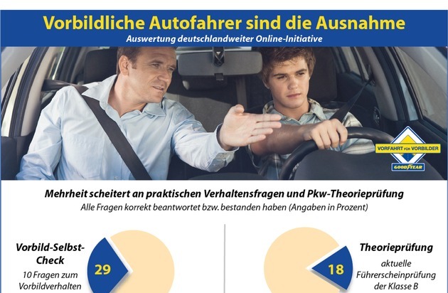 Der Vorbild-Selbst-Check und die Theorieprüfung bilden das Herzstück der im Frühjahr 2015 unter dem Motto "Vorfahrt für Vorbilder" von Goodyear ins Leben gerufenen Initiative zur Verbesserung der Verkehrssicherheit von Fahranfängern. Beide können online unter www.vorfahrt-fuer-vorbilder.de von jedermann absolviert werden. Unterstützt wird Goodyear bei der Initiative, für welche die Eltern-Befragung aus dem Jahr 2014 den Anstoß gab, von Partnern wie dem Automobilclub von Deutschland (AvD) und dem TÜV Hessen. Die Ergebnisse beider Tests wurden im Rahmen einer Podiumsdiskussion mit Experten im sächsischen Riesa am Montag vorgestellt.