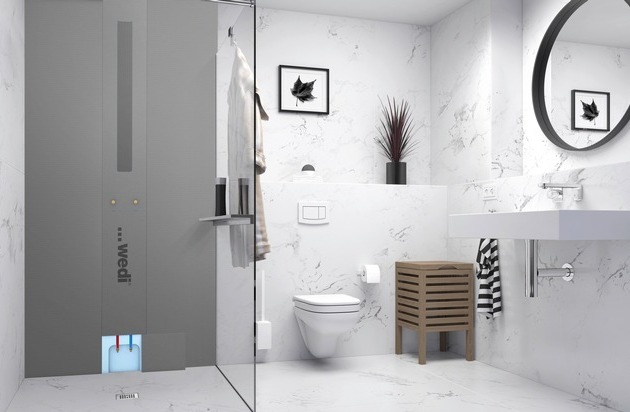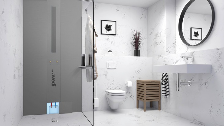 Das neue Wandelement fügt sich harmonisch in das bestehende wedi Systemportfolio ein. Es kann als Rückwandinstallation oder als Teil längerer Trennwände eingesetzt werden.