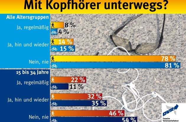 Jeder fünfte Fußgänger (22 Prozent) und fast jeder fünfte Radfahrer (19 Prozent) ist regelmäßig oder hin und wieder mit Kopfhörern im Straßenverkehr unterwegs. Dies ergab eine repräsentative Befragung, die im Auftrag des Deutschen Verkehrssicherheitsrates (DVR) im Mai 2015 vom Marktforschungsinstitut Ipsos bei 2.000 Personen über 14 Jahren durchgeführt wurde. Betrachtet man nur die jüngere Altersgruppe bis 34 Jahre, liegen die Anteile noch weit höher: Jeder zweite junge Fußgänger (54 Prozent) und Radfahrer (46 Prozent) trägt im Straßenverkehr regelmäßig oder hin und wieder Kopfhörer. Fast ein Drittel der Befragten (30 Prozent) sind nach eigenen Angaben schon einmal in eine gefährliche Situation geraten, weil andere Personen zu Fuß oder auf dem Fahrrad Kopfhörer getragen haben. Der DVR weist darauf hin, dass eine Beeinträchtigung des Gehörs, wie sie durch laute Musik oder Telefongespräche über Kopfhörer entstehen kann, durch die Straßenverkehrsordnung (StVO) ausdrücklich verboten ist.
