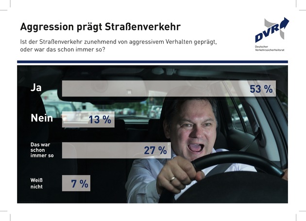 Über die Hälfte der Autofahrerinnen und Autofahrer (53 Prozent) ist der Meinung, dass der Straßenverkehr zunehmend von aggressivem Verhalten geprägt ist. Etwa ein Viertel (27 Prozent) ist der Auffassung, das sei schon immer so gewesen. Dies ergab eine repräsentative Befragung, die im Auftrag des Deutschen Verkehrssicherheitsrates (DVR) im Juni 2016 vom Marktforschungsinstitut Ipsos bei 2.000 Personen über 14 Jahren durchgeführt wurde. Demnach ist Aggression für acht von zehn Befragten ein prägendes Element im Straßenverkehr. Als Beispiele für aggressives Verhalten wurden am häufigsten zu schnelles Fahren genannt (73 Prozent), gefolgt von dichtem Auffahren/Drängeln (67 Prozent) und riskantem Überholen (65 Prozent). Aber auch Regelverstöße wie zum Beispiel die "Missachtung der Vorfahrt" und "ungeduldiges Hupen" stehen weit oben auf der Liste wahrgenommenen aggressiven Verhaltens.