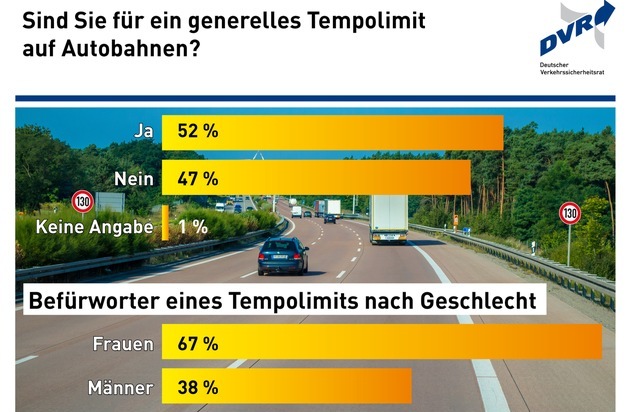 Über die Hälfte der Autofahrerinnen und Autofahrer (52 Prozent) ist der Meinung, dass es in Deutschland ein generelles Tempolimit auf Autobahnen geben sollte. Dies ergab eine repräsentative Befragung, die im Auftrag des Deutschen Verkehrssicherheitsrates (DVR) im Juni 2017 vom Marktforschungsinstitut Ipsos bei 2.000 Personen über 18 Jahren durchgeführt wurde. Nur eine geringe Minderheit (ein Prozent) hat zu der Frage keine Meinung. Ebenfalls 52 Prozent aller Befragten gaben an, dass mit einem Tempolimit die Zahl der Verkehrstoten gesenkt werden könnte. Im Jahr 2016 sind 393 Menschen auf deutschen Autobahnen ums Leben gekommen.