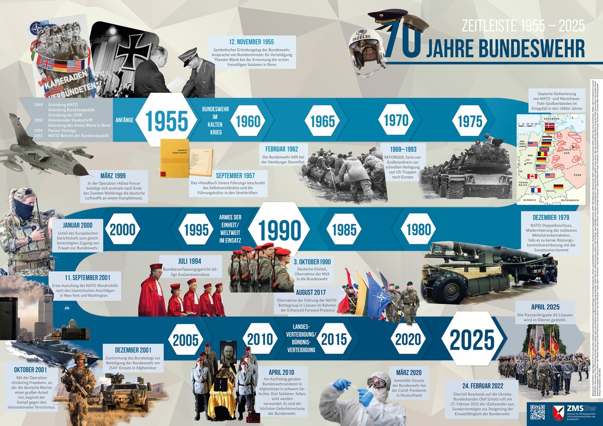 70 Jahre Bundeswehr: Die neueste Ausgabe der "Militärgeschichte" wirft einen Blick auf die ersten Jahre der Truppe (auch im Video), beleuchtet die Gründung des BMVg sowie die sogenannte Gründergeneration. Unsere Posterbeilage zeigt zudem die Geschichte der Bundeswehr zwischen 1955 und 2025 auf einem Zeitstrahl.