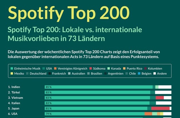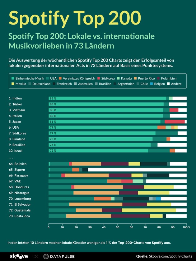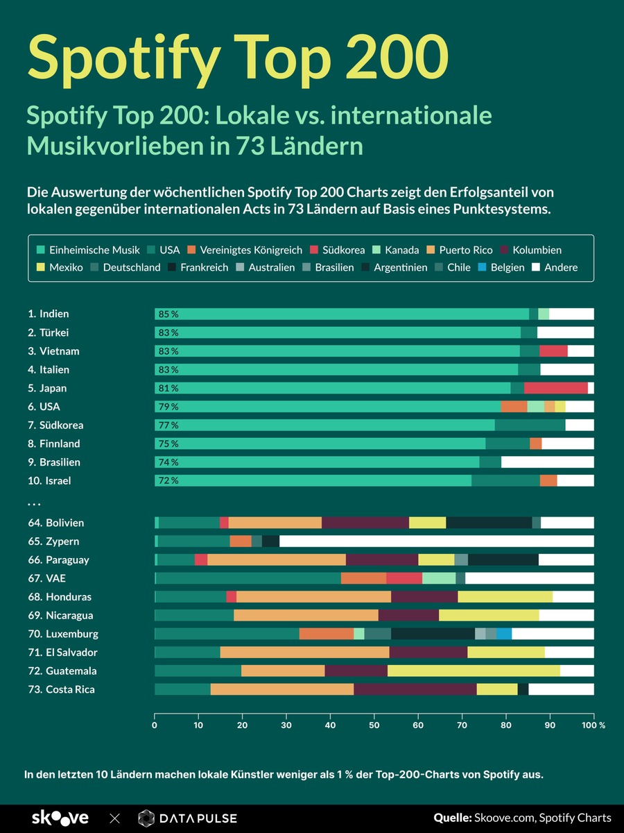 Deutschland findet sich bei der Unterstützung lokaler Musik im oberen Mittelfeld, mit Rang 26 von 73 Ländern. Deutsche Künstler machen 48 % der Spotify Top-200 Charts des Landes aus, was eine Balance zwischen heimischem Geschmack und Offenheit für globale Trends zeigt.