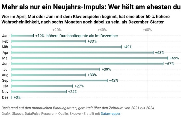 Die heute von der Berliner Klavierlern-App Skoove und dem Datenstudio DataPulse Research veröffentlichten Daten enthüllen ein "Paradox der guten Vorsätze": Obwohl rund um den Jahreswechsel die höchste Zahl an Neuanmeldungen verzeichnet wird, sind die langfristigen Erfolgsquoten ausgerechnet in dieser Phase am niedrigsten.