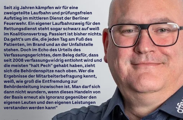 "Man kann gern der Sicht auf die Strukturreform der Polizei folgen. Aber dann bitte an der Basis beginnend und nicht an der Spitze. Seit zig Jahren kämpfen wir für eine zweigeteilte Laufbahn und prüfungsfreien Aufstieg im mittleren Dienst der Berliner Feuerwehr. Ein eigener Laufbahnzweig für den Rettungsdienst steht sogar schwarz auf weiß im Koalitionsvertrag. Passiert ist bisher nichts. Da geht's um die, die jeden Tag am Fuß des Patienten, im Brand und an der Unfallstelle stehen. Doch im Echo des Urteils des Verfassungsgerichtes, dem Beleg dafür, dass seit 2008 verfassungswidrig entlohnt wird und die meisten "halt Pech" gehabt haben, zieht sich die Behördenspitze nach oben. Wer die Ergebnisse der Mitarbeiterbefragung kennt, weiß, wie groß die Entfremdung zur Behördenleitung inzwischen ist. Man darf sich dann nicht wundern, wenn dieses Handeln von der Basis erneut als Ignoranz gegenüber den eigenen Leuten und den eigenen Leistungen verstanden werden kann", so Lars Wieg, Vorsitzender der dfeug Berlin-Brandenburg