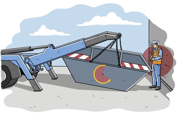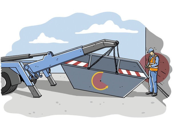 Besonders unfallrelevant ist die Quetschstelle zwischen Hubarmzylinder und Aufbaurahmen. Gefährlich ist auch der Aufenthalt zwischen schwingendem Behälter und feststehenden, benachbarten Gegenständen, etwa zwischen zwei abgestellten Containern oder zwischen einem Container und einem Gebäude. Hier kann es sehr schnell zu kritischen Situationen mit erheblichem Verletzungspotenzial kommen.