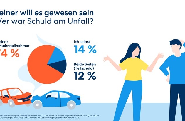 Frankfurt/Main 25.11.2025: Vier von zehn Autofahrern in Deutschland (43%) waren in den letzten drei Jahren an einem Unfall oder einer gefährlichen Situation im Straßenverkehr beteiligt. Drei Viertel von ihnen sehen die Verantwortung dafür bei anderen Verkehrsteilnehmern und nur 14 Prozent bei sich selbst. 12 Prozent räumen eine Teilschuld ein. Zu diesem Ergebnis kommt die DA Direkt Ablenkungsstudie 2025.